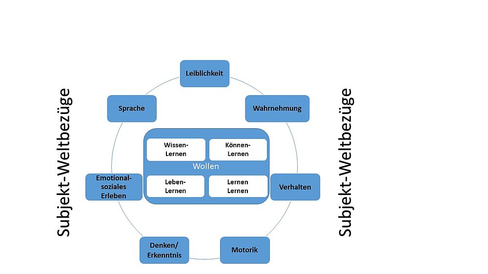 Um der Komplexität des Lernbegriffs gerecht zu werden, stützt sich das Lernverständnis der LFS bewusst auf einen weit gefassten pädagogischen Lernbegriff und die vier Lerndimensionen von Göhlich und Zirfas (2007). Wenn sich pädagogische Fragestellungen dem Prozess Vermittlung von Inhalten annähern, ist es notwendig, die Überlegungen auf der methodisch-didaktischen zu konkretisieren. Die Lerndimensionen setzen den diskursiv-reflexiven Rahmen, die didaktische Konkretisierung erfolgt dann kontextspezifisch. Der Lernbegriff muss zudem der Vielfalt und Differenz von sechs sonderpädagogischen Fachrichtungen gerecht, weshalb in einem äußeren Ring verschiedene Entwicklungsbereiche eine sonderpädagogische Perspektive auf Lernen konturieren. Das Wollen steht als Grundlage und Antrieb menschlicher Lernfähigkeit im Mittelpunkt, da das Wollen den anderen vier Lerndimensionen vorgängig erscheint (Wilhelm 2021). Die vertretene subjektorientierte Sichtweise vernachlässigt nicht die Bedeutung der Mitmenschen und der Welt für das Lernen, weshalb die Subjekt-Weltbezüge, also die Verhältnisse des Subjekts zu sich selbst, zu anderen und zur Welt, als weitere Reflexionsfolie berücksichtigt werden (vgl. u. a. Koller 2018).